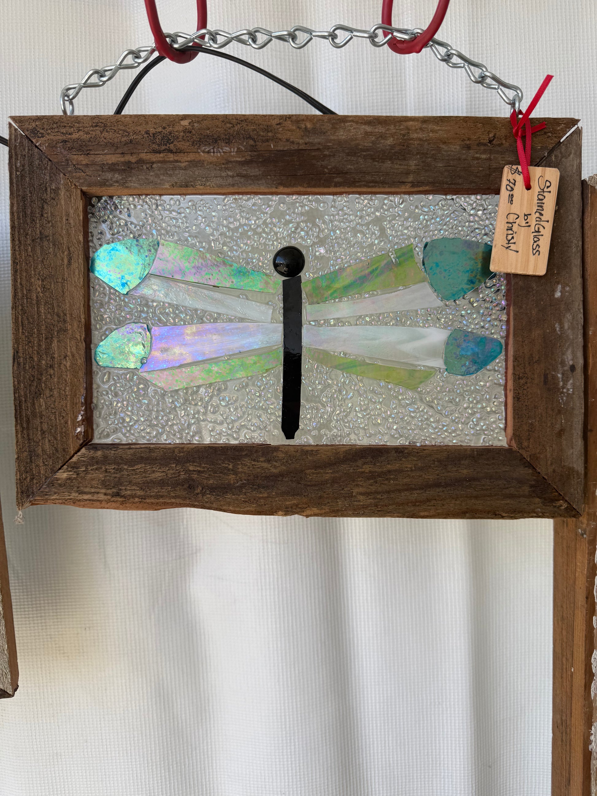 This small handcrafted stained glass window features a delicate dragonfly design, meticulously created from handcut glass pieces. Each element is carefully set in resin within a handmade frame, ensuring durability and a refined finish. Ideal for adding a touch of artisanal elegance to any space, this piece showcases expert craftsmanship and timeless beauty.